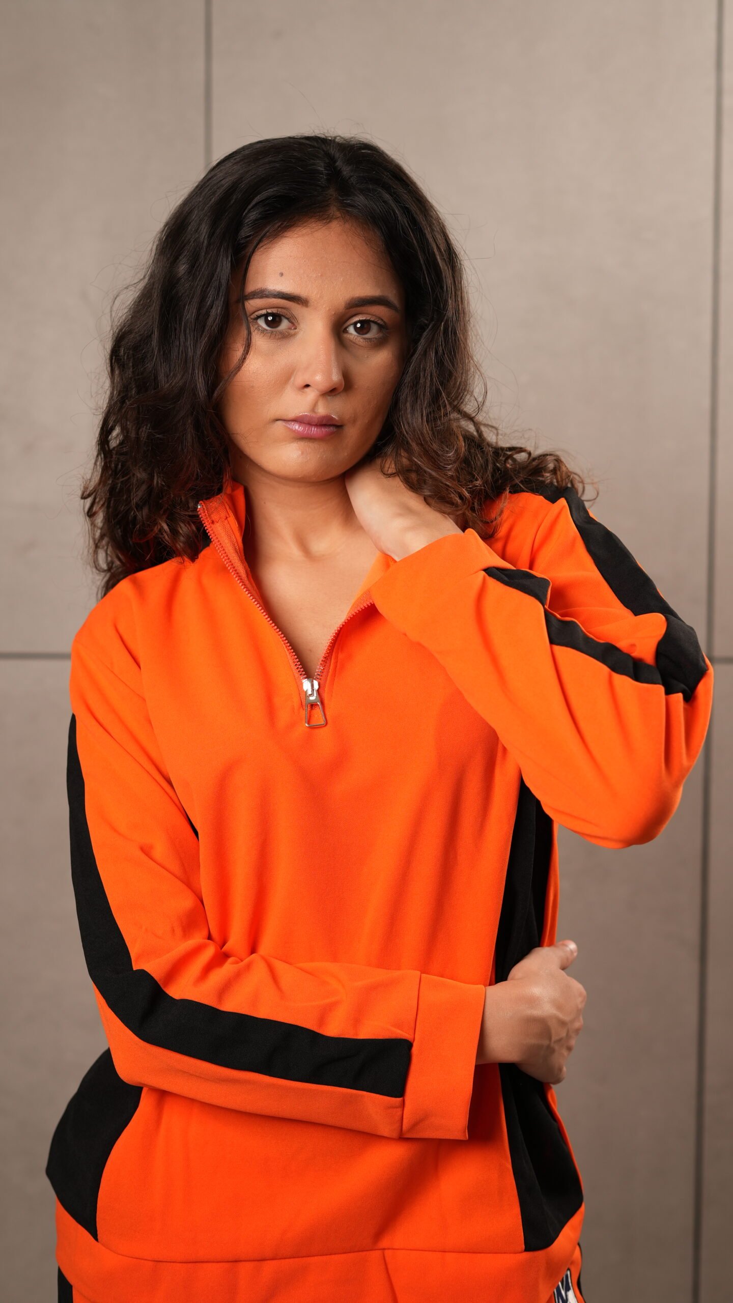 Step into bold, sporty style with this Orange & Black Track Co-ord Set from ANJ Creations. Designed for women who love comfort with a statement, this set includes a zip-up high-neck sweatshirt and perfectly tailored straight-fit pants. The striking black side panels create a contouring effect, enhancing the silhouette while keeping the look fresh and dynamic. Crafted from soft, breathable fabric, it ensures maximum comfort for travel, jogging, gym warm-ups, or casual day outings.
